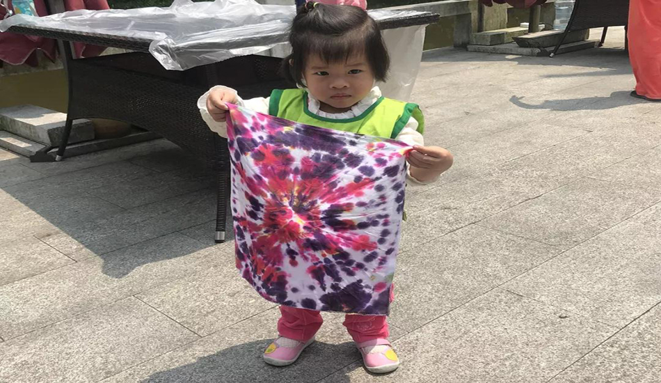 扎染是中国民间传统而独特的染色工艺,让宝贝们感受我国民间艺术的风采,感受扎染的图案美、色彩美和形式美,用了多种不同的形式对手绢进行扎染的方法,促进了粑粑麻麻和宝贝之间的亲子互动。